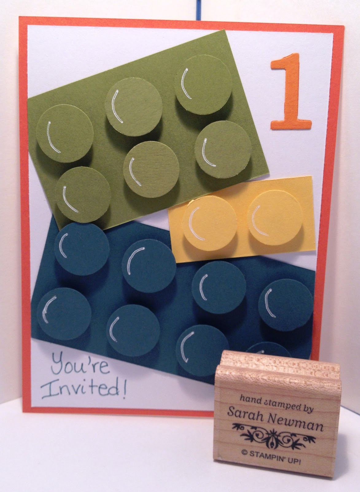We're doing a Mega Blocks/Lego theme for Z's birthday next month- so these are the invites that I created to send out! I cased this card from Angela McKay, and changed up the colours to suit the papers I had on hand. The circles are the 3/4" punch and the colours are old olive, daffodil delight and Not Quite Navy. I used the white gel pen to create the highlights on the circles and popped them up with dimensionals. Ange had hers all nicely sponged, but as I was creating 15 of these I decided to skip that step! I think they still look ok....